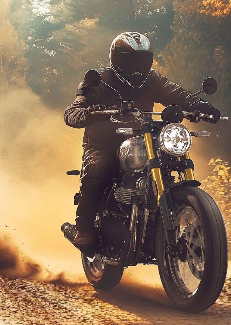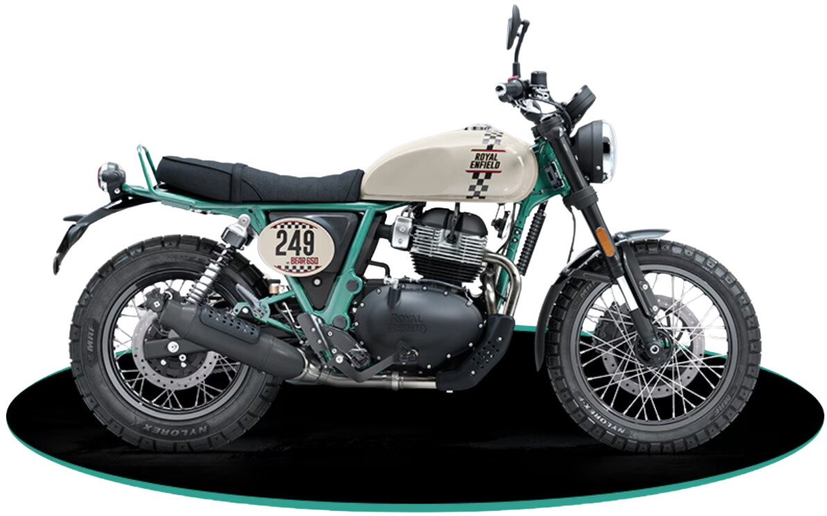 A road scrambler with a sixties soul. Inspired by the Big Bear Run in the Californian desert. Fueled by gut feel, powered by the acclaimed Royal Enfield parallel twin.