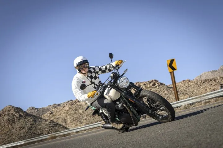 Chunky dual purpose tUres are a key scrambler feature. They provide more grip on loose surfaces without losing confidence on tarmac. The open square tread blocks give a retro flavor.