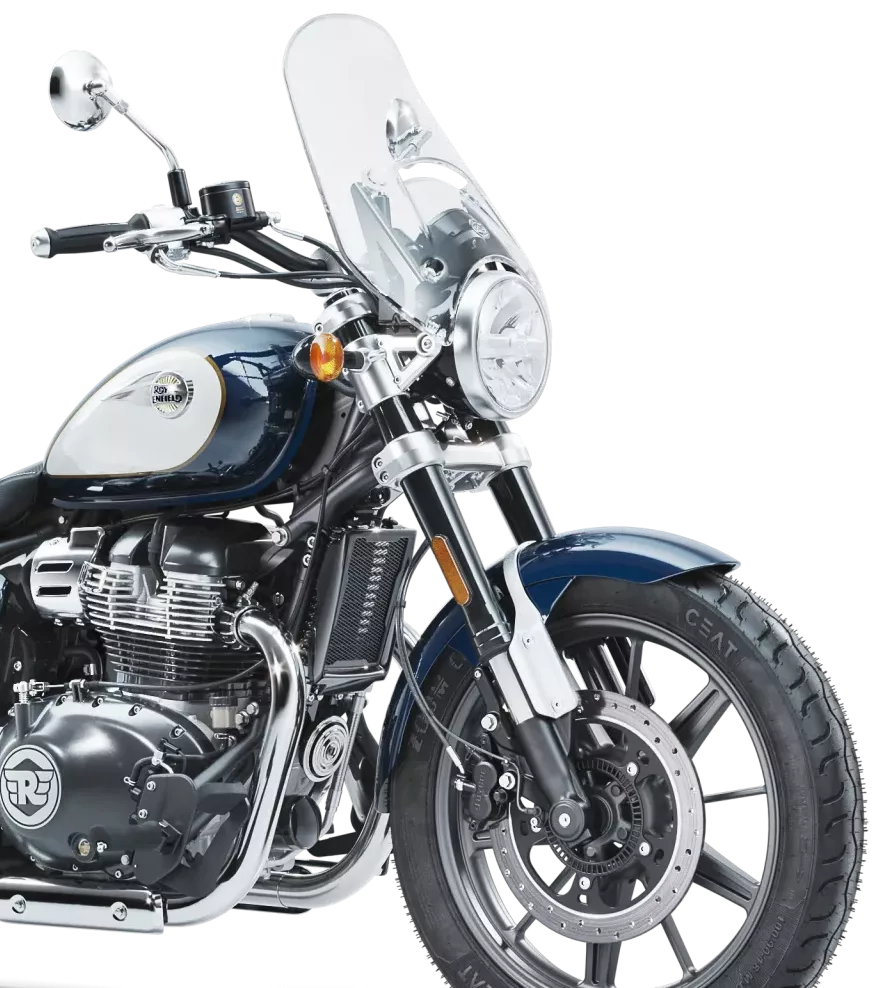 The Super Meteor 650 sits on an all-new frame that’s been sculpted around its twin engine, ensuring nimbleness and ease of handling while adding to its quintessential cruiser form. A tubular spine frame, relaxed riding stance and low centre of gravity give you every bit of the solidity and stability you need, whether you’re cruising down the highway or navigating a busy street.